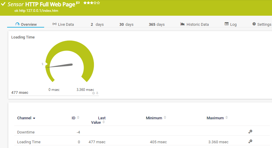 The HTTP Full Web Page sensor monitors the full download time of a web page including assets such as images. In the background, it opens the web page in a browser instance to perform the measurement. It does not follow links.