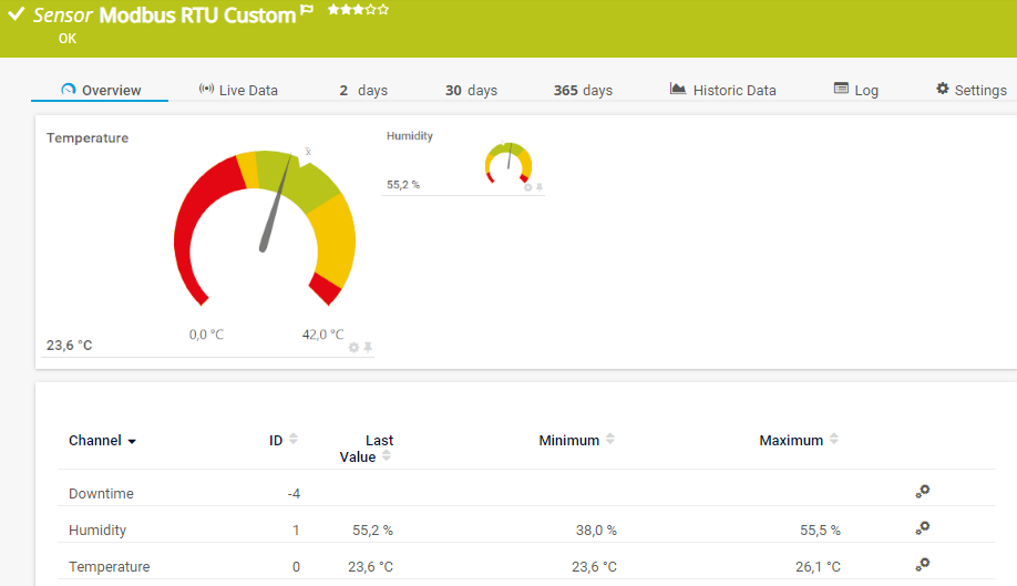 In the channel table on the Overview tab, this channel never shows any values. PRTG uses this channel in graphs and reports to show the amount of time in which the sensor was in the Down status
