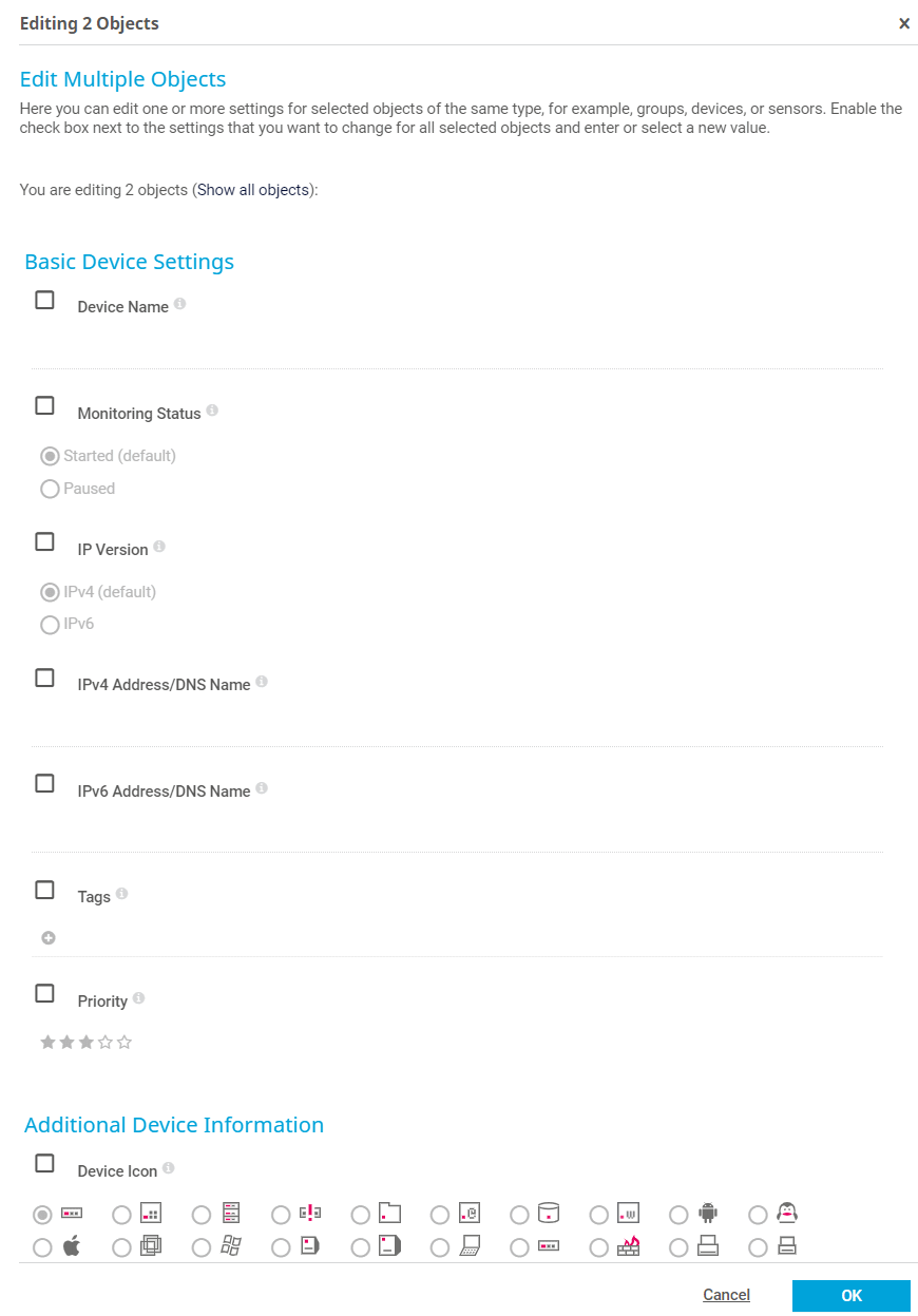 Click b_multi_edit_settings in the multi-edit menu to open the Edit Multiple Objects dialog. This dialog shows most of the settings that the selected objects have in common. For example, you can edit the name, tags, priority, scanning interval, or access rights. The available options depend on the selected objects.