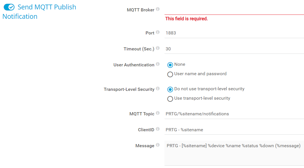 Enter the topic for the MQTT publish notifications. The default topic is PRTG/%sitename/notifications.