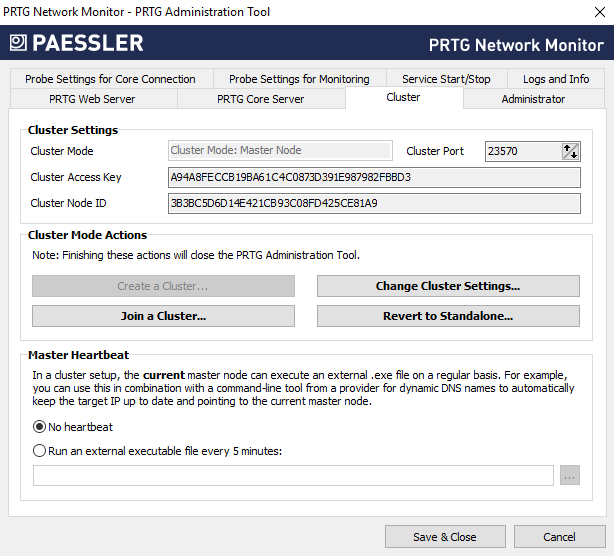 On the Cluster tab, you can change how the PRTG core server behaves in a cluster. Before you change settings here, see section Failover Cluster Configuration.