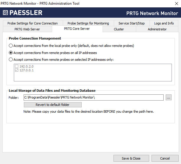 Accept connections from remote probes on all IP addresses: Accept incoming connections from remote probes, no matter on which IP address of the PRTG core server they come in.