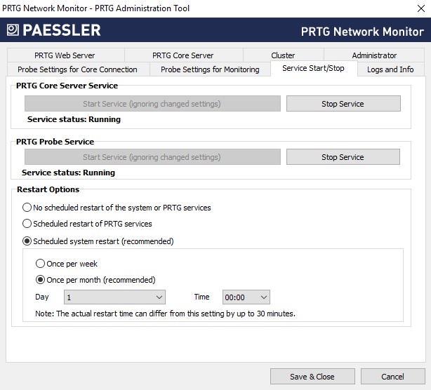 No scheduled restart of the system or PRTG services: Do not automatically perform a scheduled restart of services. We recommend that you manually restart the PRTG core server system every few weeks. You can also restart the PRTG core server service and PRTG probe service under Administrative Tools in the PRTG web interface.