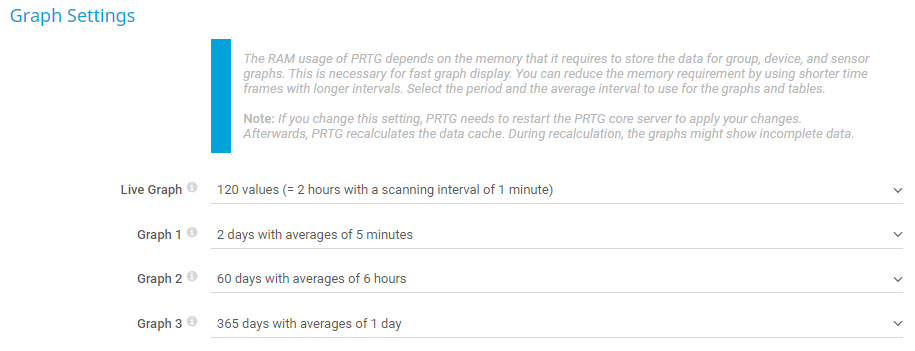 PRTG shows several graphs on the Overview tabs and xDays tabs of objects in the PRTG web interface. PRTG keeps these in RAM for fast graph display. The longer the time frames and the shorter the intervals are, the more memory PRTG uses for this. You can adapt the details for all four graphs. This setting also changes the caption of the graphs and tabs in the PRTG web interface and thePRTG app for desktop.