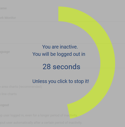 If the value you enter is greater than 1 minute, a logout countdown appears 1 minute before PRTG logs out users. If the value is 1 minute, users see the logout countdown 30 seconds before PRTG logs them out. Click in the browser window to stop the countdown and to stay logged in to the PRTG web interface.
